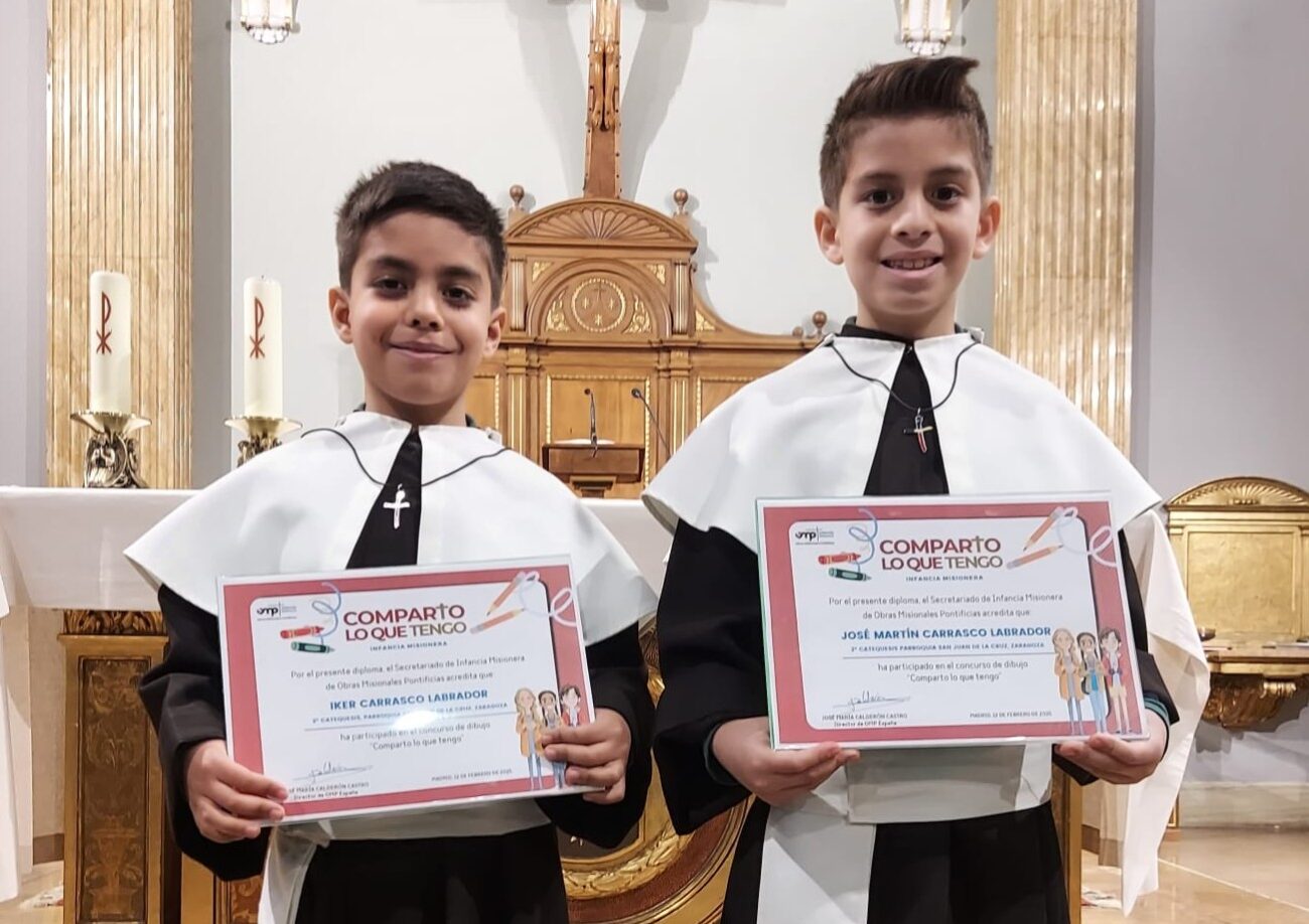 En el concurso de dibujo “Comparto lo que tengo”, organizado por el Secretariado de Infancia Misionera de Obras Misioneras Pontificias, los hermanos José Martín e Iker de 2º de catequesis de nuestra Parroquia, han quedado finalistas, recibiendo su diploma y la Cruz que los acredita como Misioneros Infanti les. Felicidades a los dos.